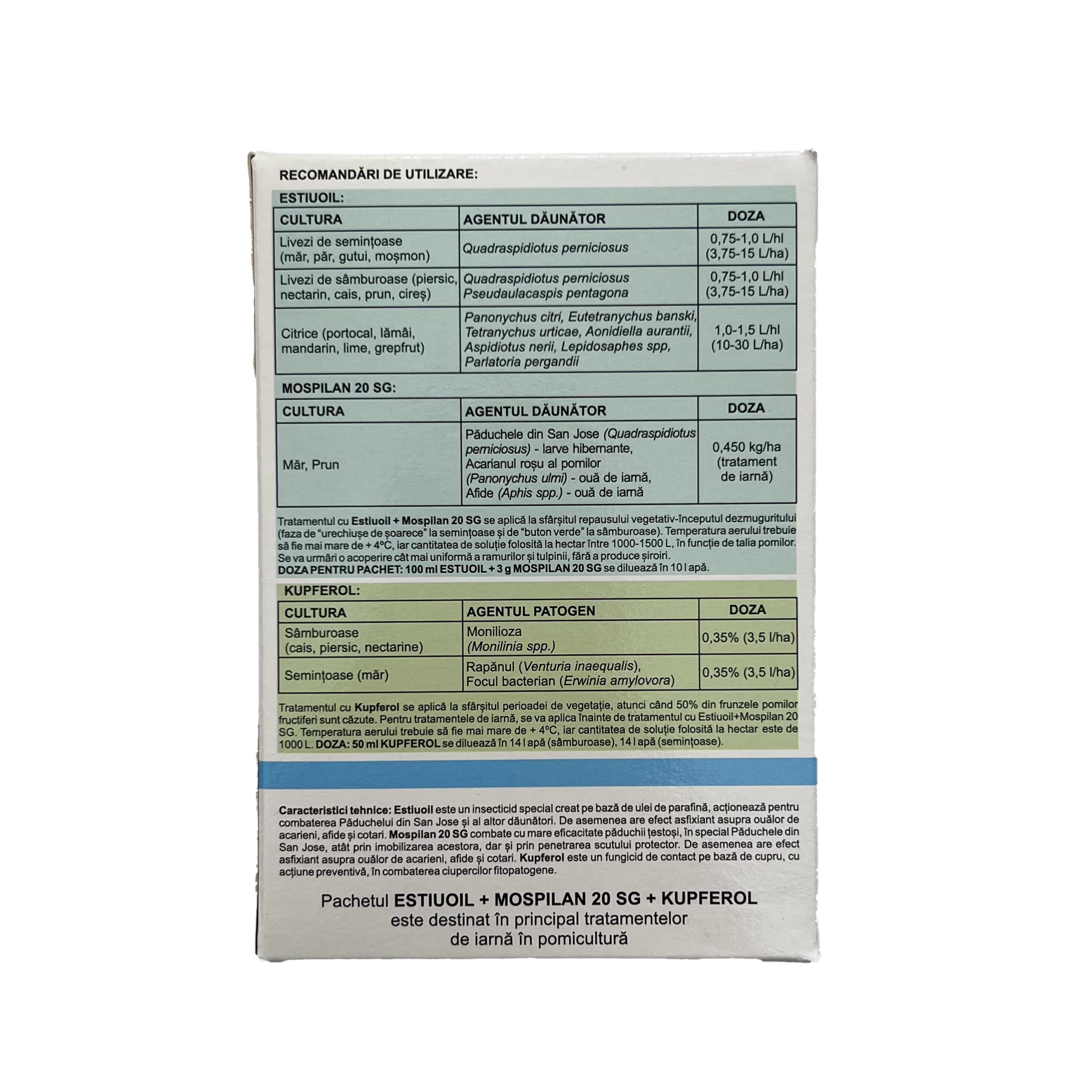 Al doilea tratament se va efectua la10-14 zile dupa tratamentul cu KUPFEROL, fiind un amestec intre doua produse insecticide: uleiul horticol-insecticid ESTIUOIL, bazat pe 790 g/l ulei de parafina, si insecticidul MOSPILAN, cu 200 g/kg acetamiprid ca substanta activa. Acestea au rolul de a combate eficient daunatorii inca din stadiul de ou sau larva de pe ramurile pomilor sau arbustilor. Uleiul horticol ESTIUOIL creeaza o pelicula continua care impiedica respiratia oualor sau larvelor, in timp ce insecticidul MOSPILAN asigura eliminarea daunatorilor si patrunde rapid in planta iar prin actiunea sistemica asigura protectie pe o perioada indelungata. Astfel, acest amestec se dovedeste eficace in combaterea insectelor care ierneaza sub forma de ou (inelar, afide, acarieni) pe ramuri, in crapaturile scoartei sau cele care formeaza colonii pe pomi (paduchii testosi, paduchii lanosi etc.).