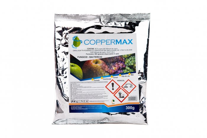 Coppermax, este un fungicid ce se prezintă sub formă de granule fine, omogene, fără tendinţă de sfărâmare, de culoare bleu-vernil. Se aplică în perioada de vegetaţie, la avertizare, ca tratament foliar preventiv şi curativ.