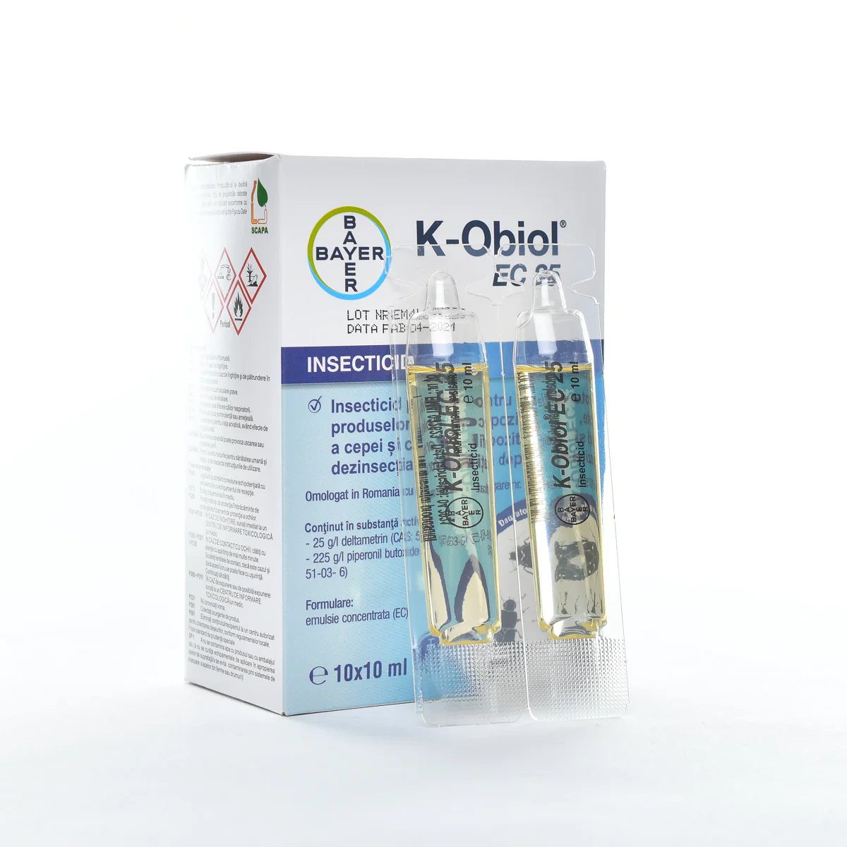 Insecticidul K-OBIOL 25 EC contine 25 g/l Deltametrin + 225 g/l Piperonil butoxid tehnic si este conditionat sub forma de concentrat emulsionabil. K-Obiol este un insecticid piretroid care se recomanda spre a fi utilizat pentru a proteja cerealele si legumele depozitate impotriva celor mai raspanditi daunatori. Spatiile care pot fi tratate includ silozuri de cereale, depozite de legume, fructe sau plante tehnice, magazii, etc.