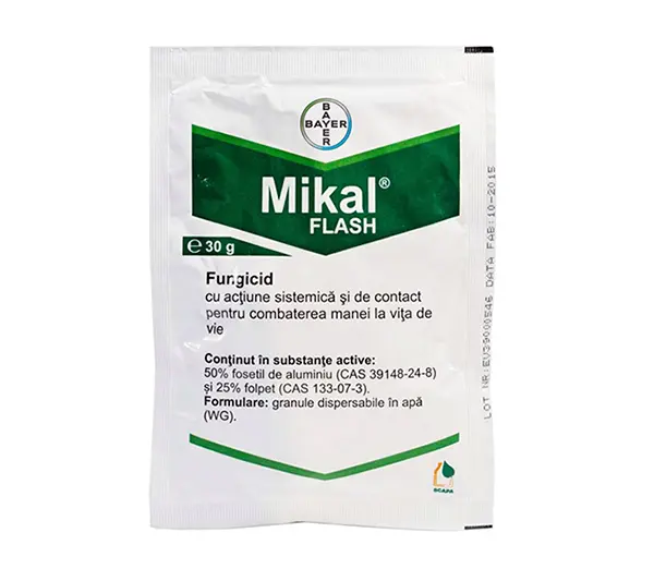 Fungicidul sistemic MIKAL FLASH contine Fosetil de aluminiu 50% + folpet 25%, sub forma de granule dispersabile in apa.