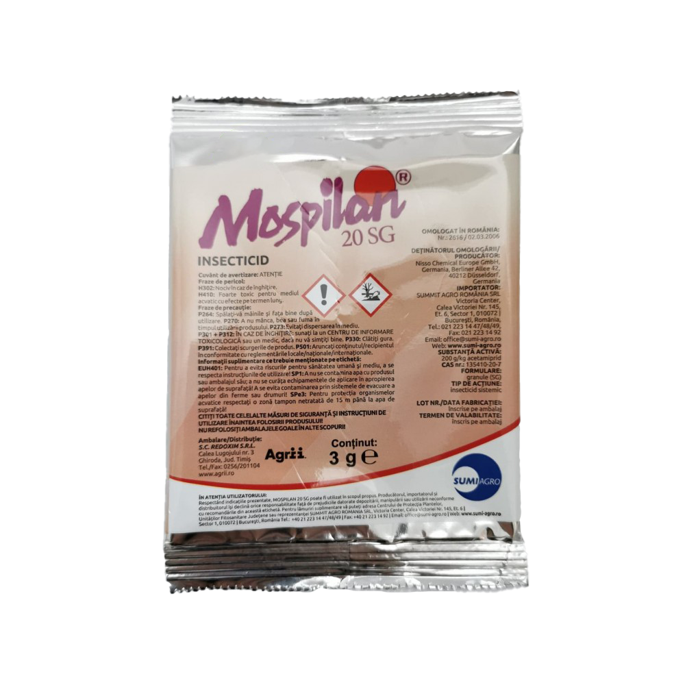 - Insecticidul MOSPILAN 20 SG ambalat la 3 g se aplica intr-o cantitate de apa de 20 L.