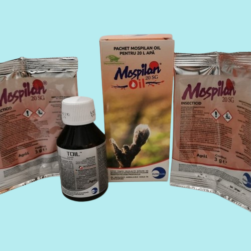 Pachetul MOSPILAN OIL 20L contine doua plicuri de insecticid Mospilan ambalat la 3 G si 100 ML adjuvant Toil. Este o solutie inovatoare pentru tratamentele preventive din pomicultura si se recomanda spre a fi utilizata impotriva paduchilor testosi, in special a Paduchelui de San Jose, actionand prin imobilizarea acestora si prin penetrarea scutului lor protector. De asemenea, se dovedeste a fi un aliat puternic impotriva oualor de acarieni, afide si cotari, exercitand asupra lor un efect asfixiant.