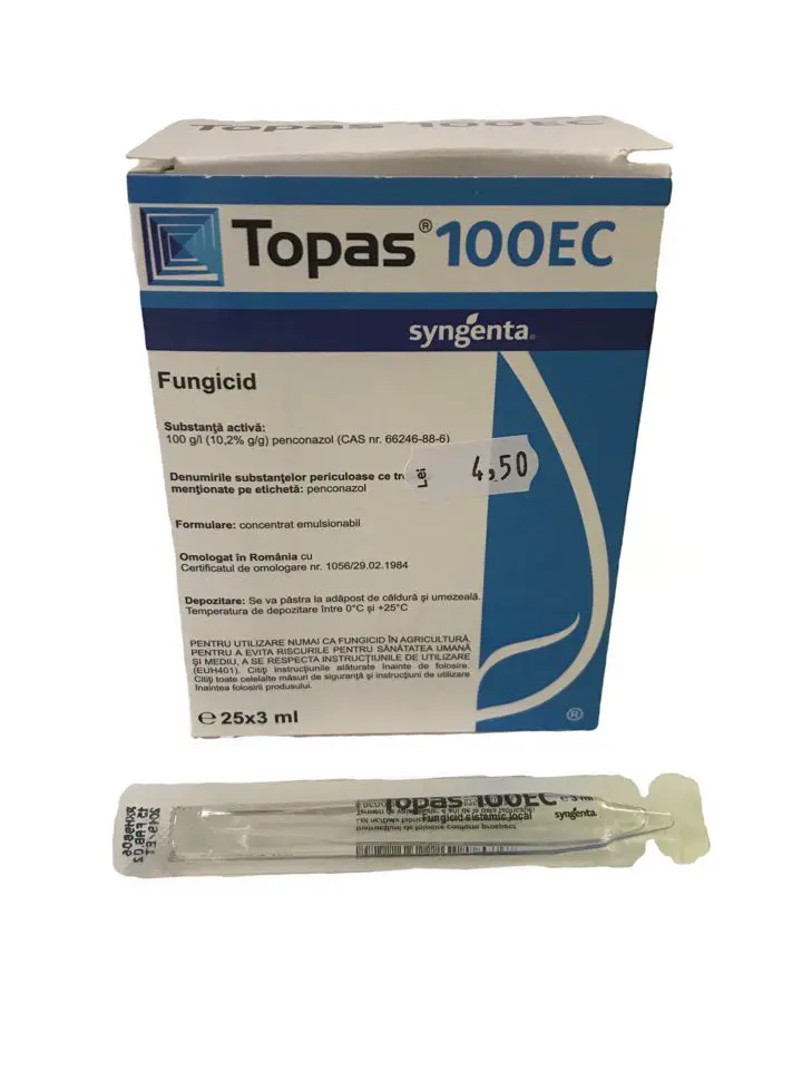 Fungicidul  TOPAS 100 EC, contine Penconazol 100 g/l si se prezinta sub forma de concentrat emulsionabil in apa. Produsul este recomandat la nivel mondial spre a fi utilizat in combaterea diferitelor specii de fainare, mai cu seama a infectiilor primare.